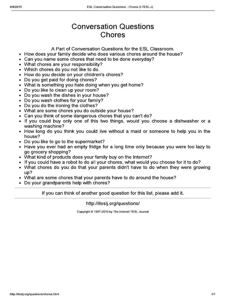 TESOL Journal TJ is a refereed practitioner-oriented electronic journal based on current theory and research in the field of TESOL. Apr 3 2018 - A list of questions you can use to generate conversations in the ESLEFL classroom. Conversation questions for the esl efl classroom a project of the internet tesl journal if this is your first time here then read the.
